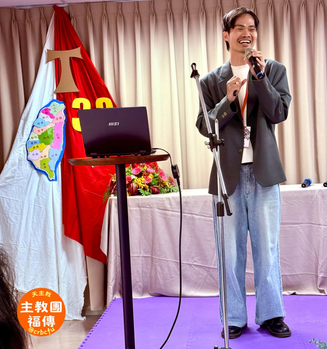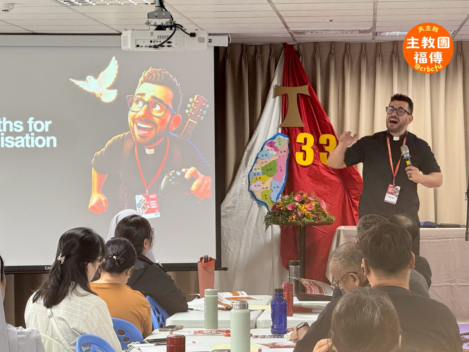 揚名國際的知名福音歌手Rob Galea神父這次也特別遠從澳洲飛來台灣參加峰會,分享他與主相遇的個人生命經驗,也介紹他在鐸職生活中如何以音樂、電玩靠近Z世代青年的心,營造福傳的機會。雖然Rob Galea神父只是拿著吉他簡單地開始音樂祈禱,現場所有人卻都能夠在他的歌聲中感受到聖神所親自賜予的喜樂平安和滿滿活力,也讓與會青年的心熱情興奮、開始思考如何運用天主賜予自己的塔冷通。在這些祈禱時刻,讓整個峰會不僅停留在策略與方法層次的討論,更回到信仰的核心。與會者共同體會到,福傳工作的根基不僅在於人的努力,更在於天主的帶領與恩寵。